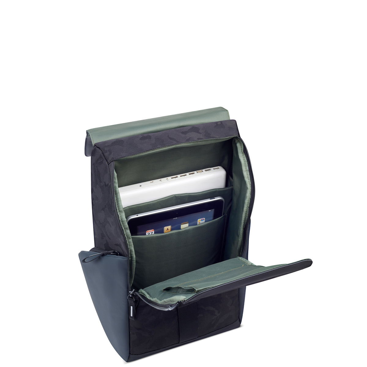 The two wide-opening zips on the sides provide easy access to the main compartment when the backpack is opened via its intelligent closure system.Inside the compartment are two reinforced padded pockets designed to accept a 16" laptop and a tablet, the rest of the space where you can store all your other items, and two small closed pockets for your personal effects.Two large & instantly accessible pockets for storing a bottle of water or other items are provided on the sides. There is also a small zipped pocket at the bottom on the backwhere personal items can be securely stored for easy access!