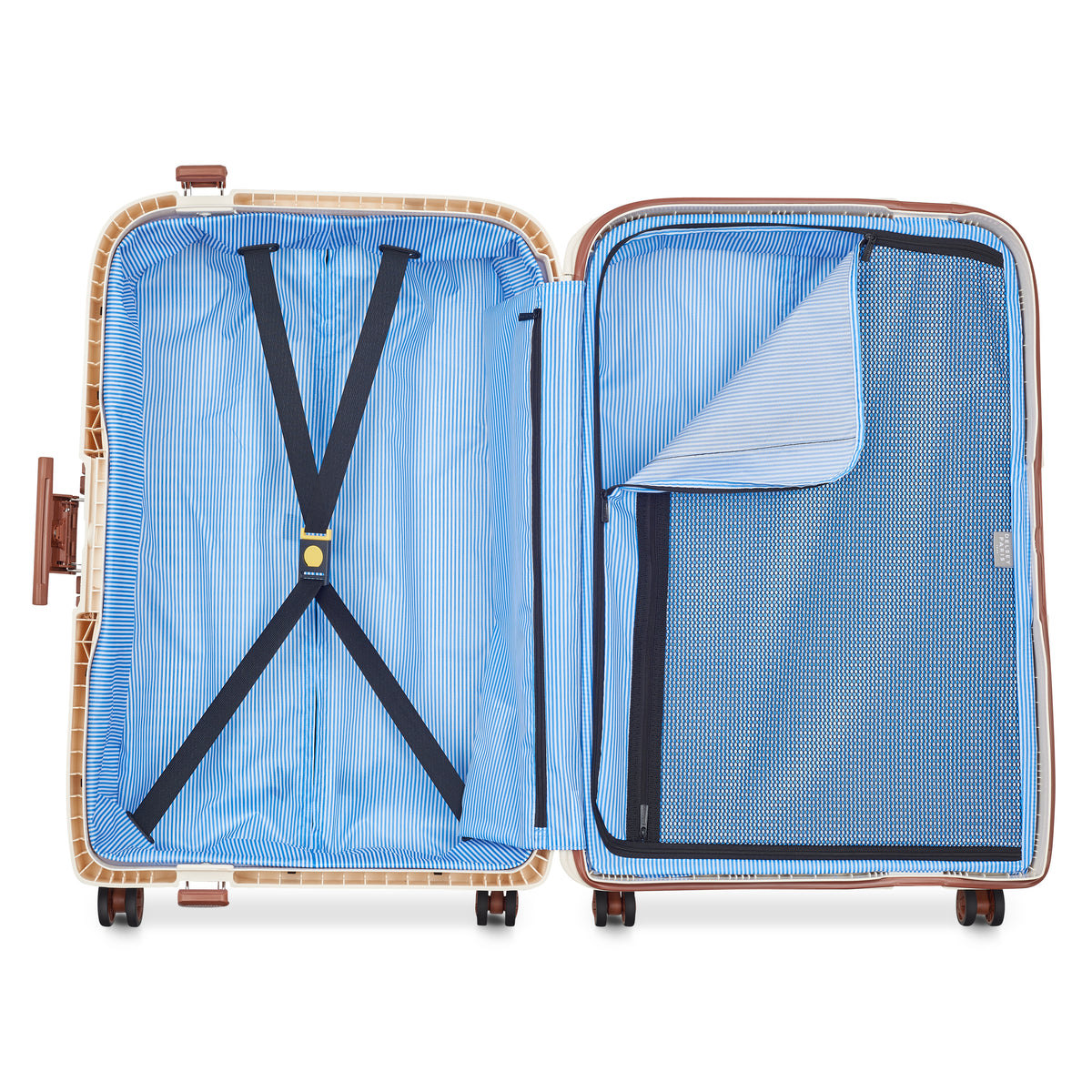 These suitcases feature two separate compartments, one fitted with a set of straps and the other with a zipped mesh divider.