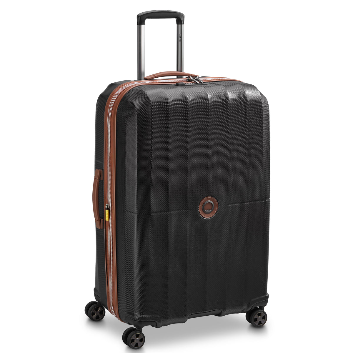 This luggage has an ultra-durable rigid shell, designed to withstand knocks and scratches thanks to its scratch-resistant finish. Its unique design is enhanced by touches of cognac vegan leather, for a distinctive style.
