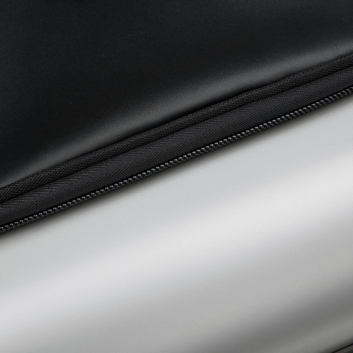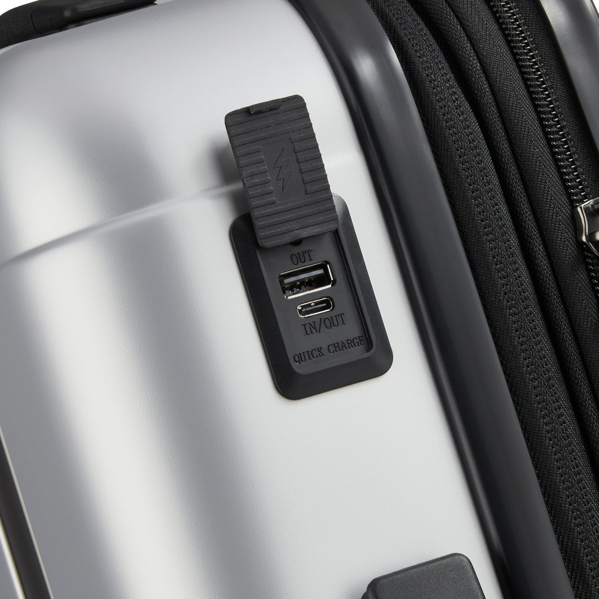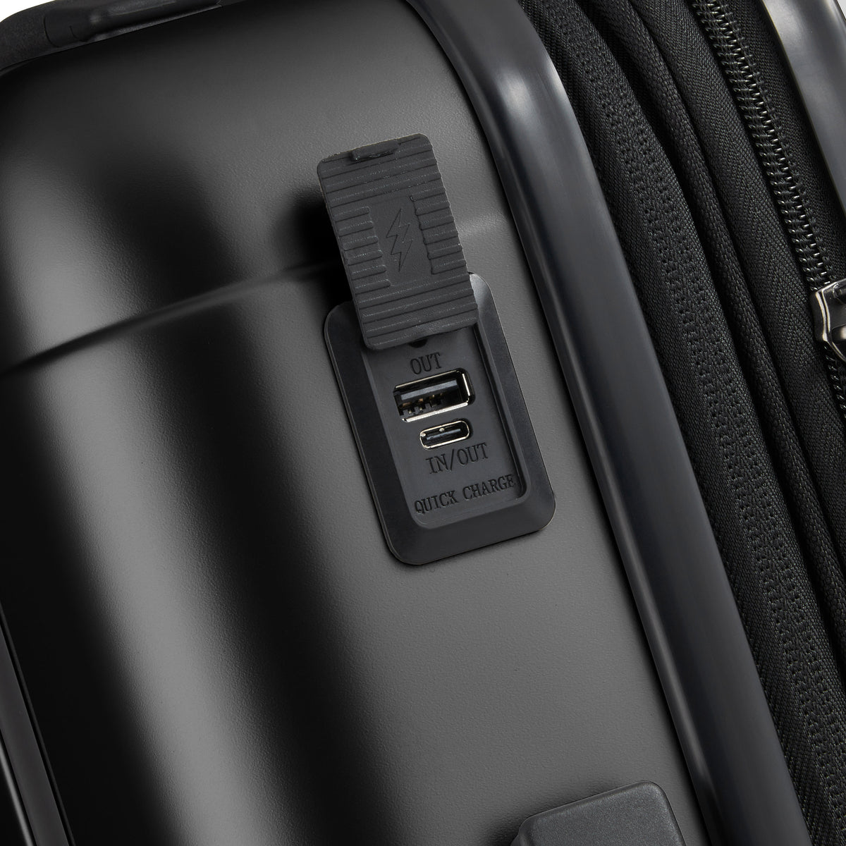 The 14" laptop or tablet is secured in a foam pocket on the front of the case. This ingenious compartment has pockets for all your business travel essentials. Slip the external battery* inside and connect the phone to the USB-C port on the outside of the case. In addition, the luggage that can be adapted to the amount you are carrying, thanks to the expanders.